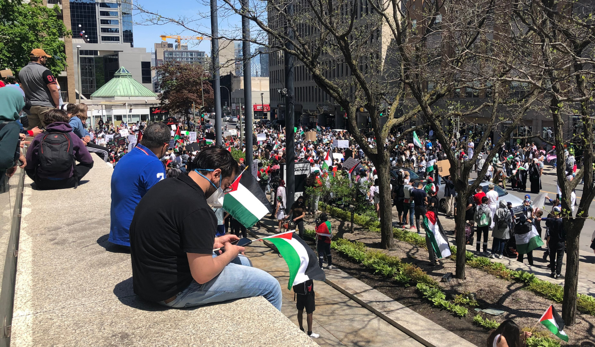 After the march, as protesters gathered in front of the Israeli consulate, a window was smashed and tear gas was deployed by Montreal police.