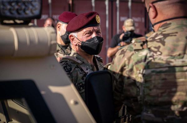 King Abdullah, accompanied by His Royal Highness Crown Prince Al Hussein bin Abdullah II, was received at the location of the exercise by Chairman of the Joint Chiefs of Staff Maj. Gen. Yousef Hneiti and senior JAF officers.