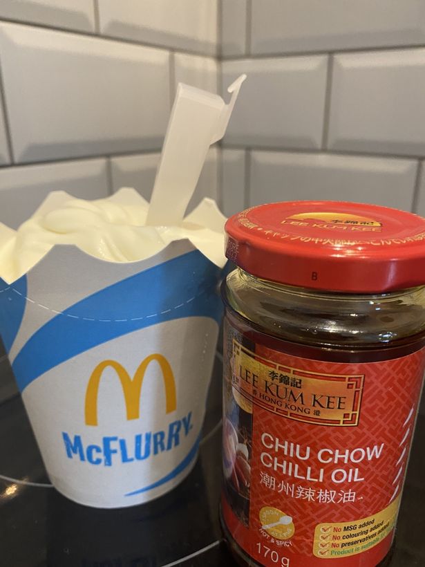 I used Uber Eats to order some ice cream from my nearest McDonald's (they didn't offer sundaes, so a plain McFlurry it was) and raided the kitchen cupboards to find a jar of Chiu Chow Chilli Oil by Lee Kum Kee.
