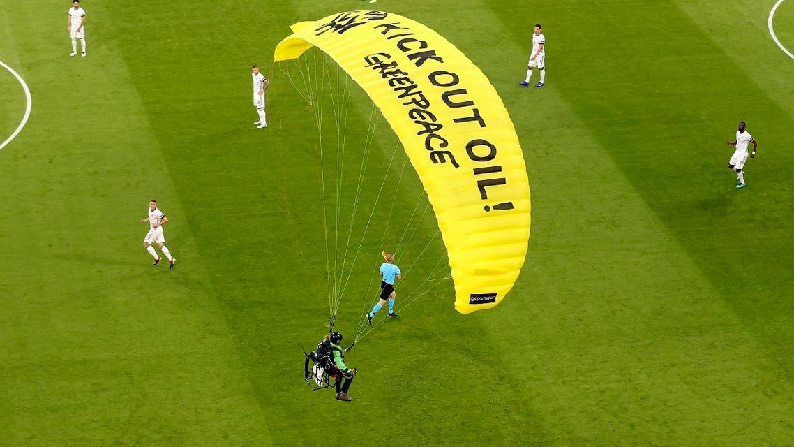 A Greenpeace protestor parachuted into the stadium before France’s game against Germany at the European Championship on Tuesday.