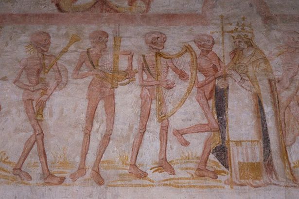 Despite the sombre nature of the paintings, the artists included some cheeky humour - a skeleton band plays while a bony figure tries to get an unwilling bishop to dance. Elsewhere, a skeleton shoves its way in between a wealthy couple, tweaking the woman’s veil and grinning at the shocked young man.