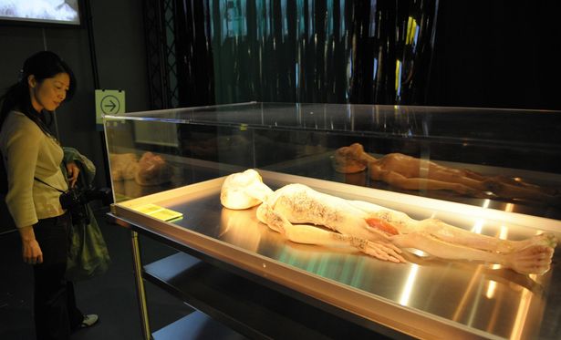 The “humanoid” alien bodies were small and fragile-looking with large lidless eyes and skin that resembled that of a shark.