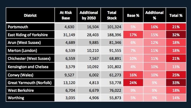 Across the country 1.3million residential and commercial addresses in Great Britain will newly be at risk of flooding by 2050, bumping up related insurance claims by an additional £122billion.