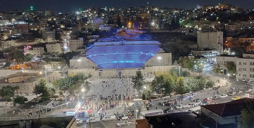 Ammon News - The Greater Amman Municipality (GAM) on Saturday night lightens a number of historical sites and landmarks in blue, namely the Roman Theatre, Jabal Al Qalaa, Abdoun Bridge, and the building of the Secretariat Council in Ras Al Ain, on the occasion of Jordan’s national day and Expo Dubai 2020. GAM also lightened various landmarks in Amman on Friday’s night, the Jordan News Agency, Petra, reported.