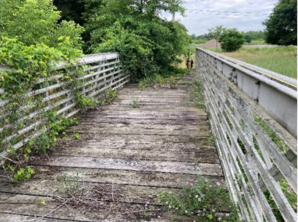 The bridge formerly served as a pedestrian walkway along the Little Cuyahoga River in Middlebury Run Park, but was moved to an open field as part of a wetlands restoration project.