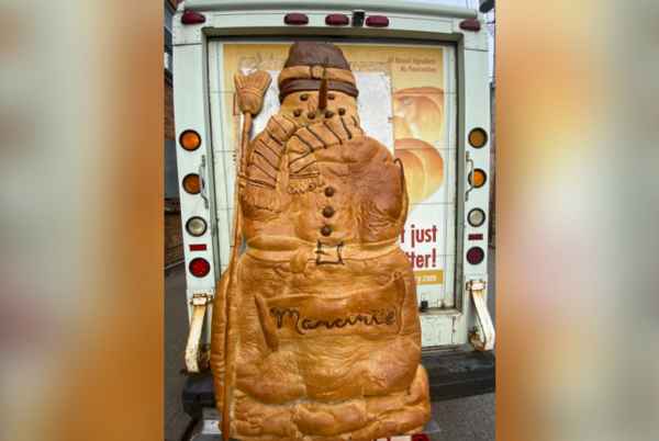 The bakery said it took seven workers to lift "Frosty the Doughman" in and out of the oven. The snowman likeness was sculpted from Italian rolls and twists, the bakery said.