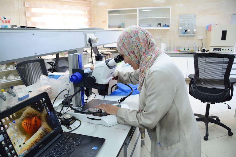 Leaning over her microscope, Maysoon Kteifan, a researcher at Aqaba’s Marine Science Station (MSS) specializing in coral restoration, says reefs are among the most diverse and most important ecosystems on the planet. “We need to do whatever we can to preserve them. Here at the station we are trying our best to help our environment restore,” she tells Mongabay.