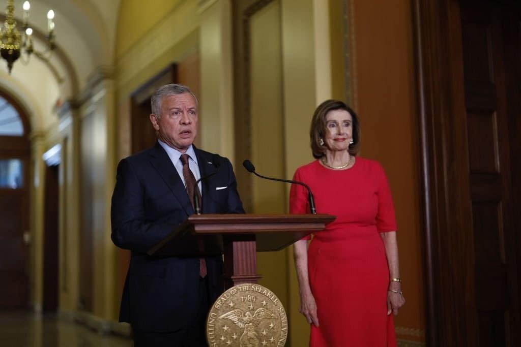 Ammon News - His Majesty King Abdullah, accompanied by His Royal Highness Crown Prince Al Hussein bin Abdullah II, met on Wednesday with US House of Representatives Speaker Nancy Pelosi, and House leadership, in Washington, DC.