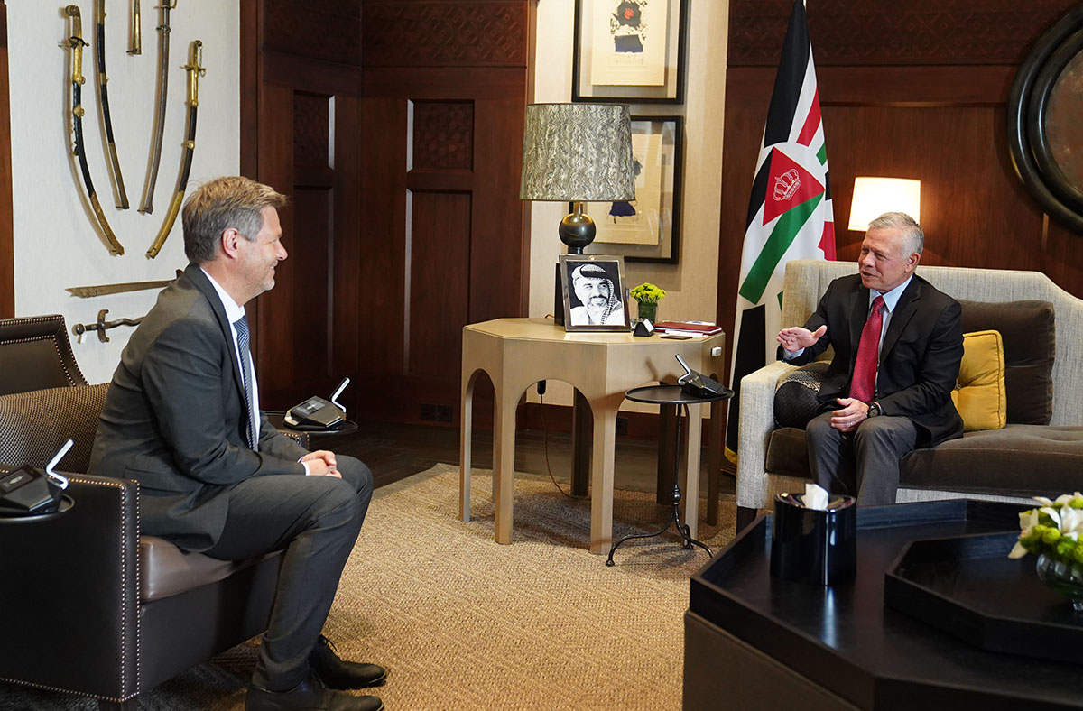 Ammon News - His Majesty King Abdullah on Wednesday received German Vice Chancellor and Federal Minister for Economic Affairs and Climate Protection Robert Habeck, at Al Husseiniya Palace.