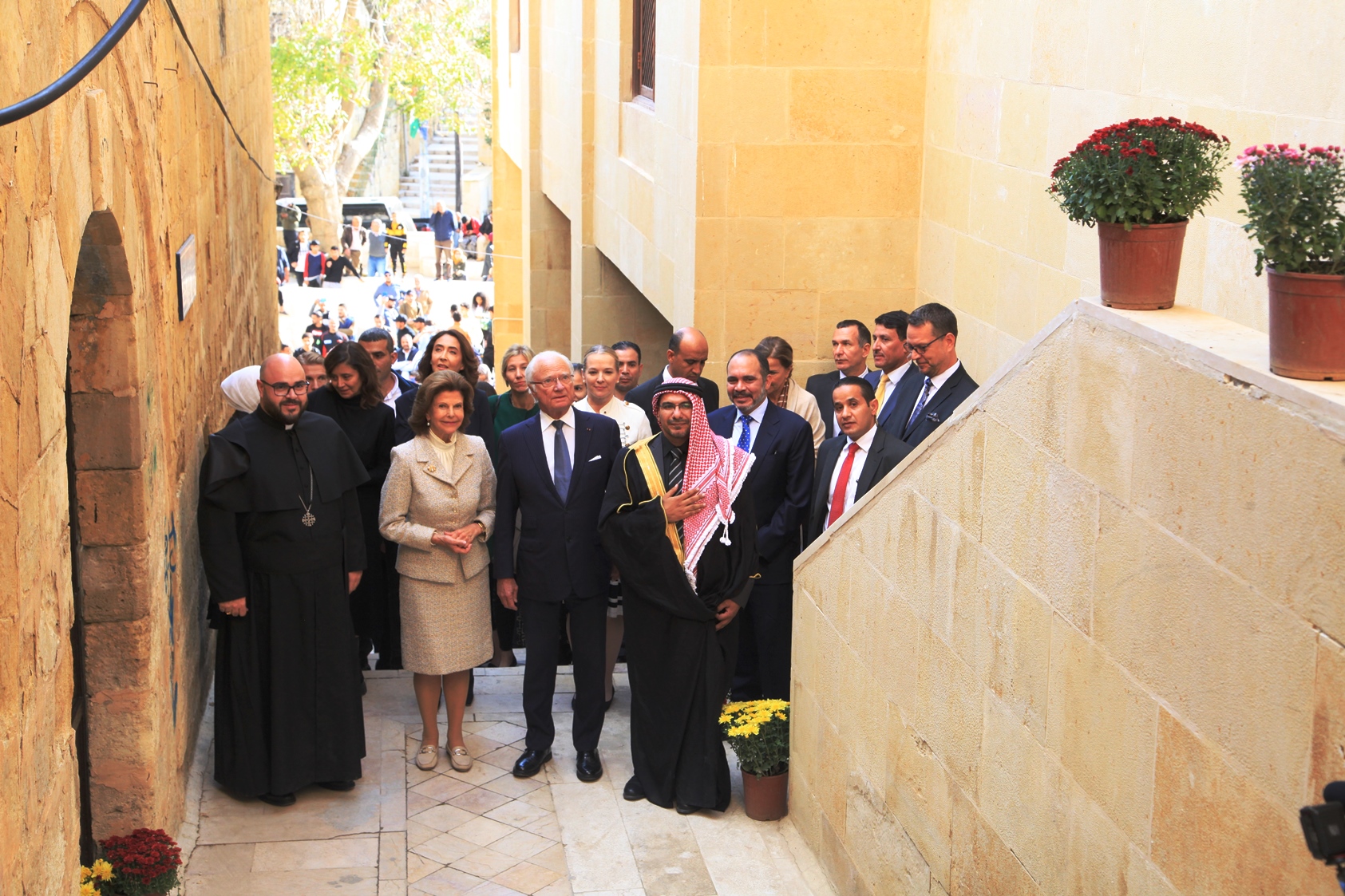 The Swedish monarch and his spouse toured the Al-Ain Plaza, then went up to the "Harmony Trail" stairs leading to the Latin Church and the Great Mosque of Salt.