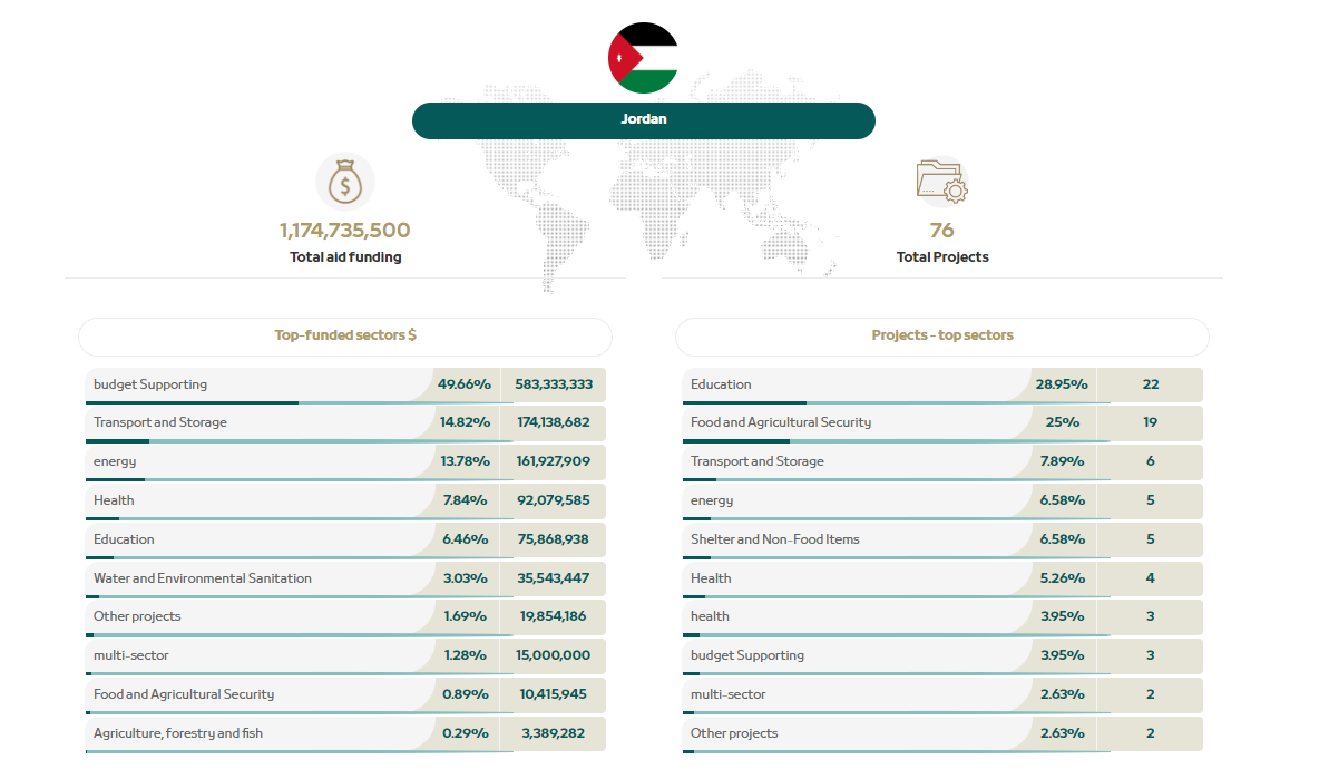 Ammon News - The total value of aid for humanitarian, development and charitable projects provided by the Kingdom of Saudi Arabia to Jordan over 44 years amounted to one billion and 174 million and 735,000 and $500, according to data from the Saudi Aid Platform.