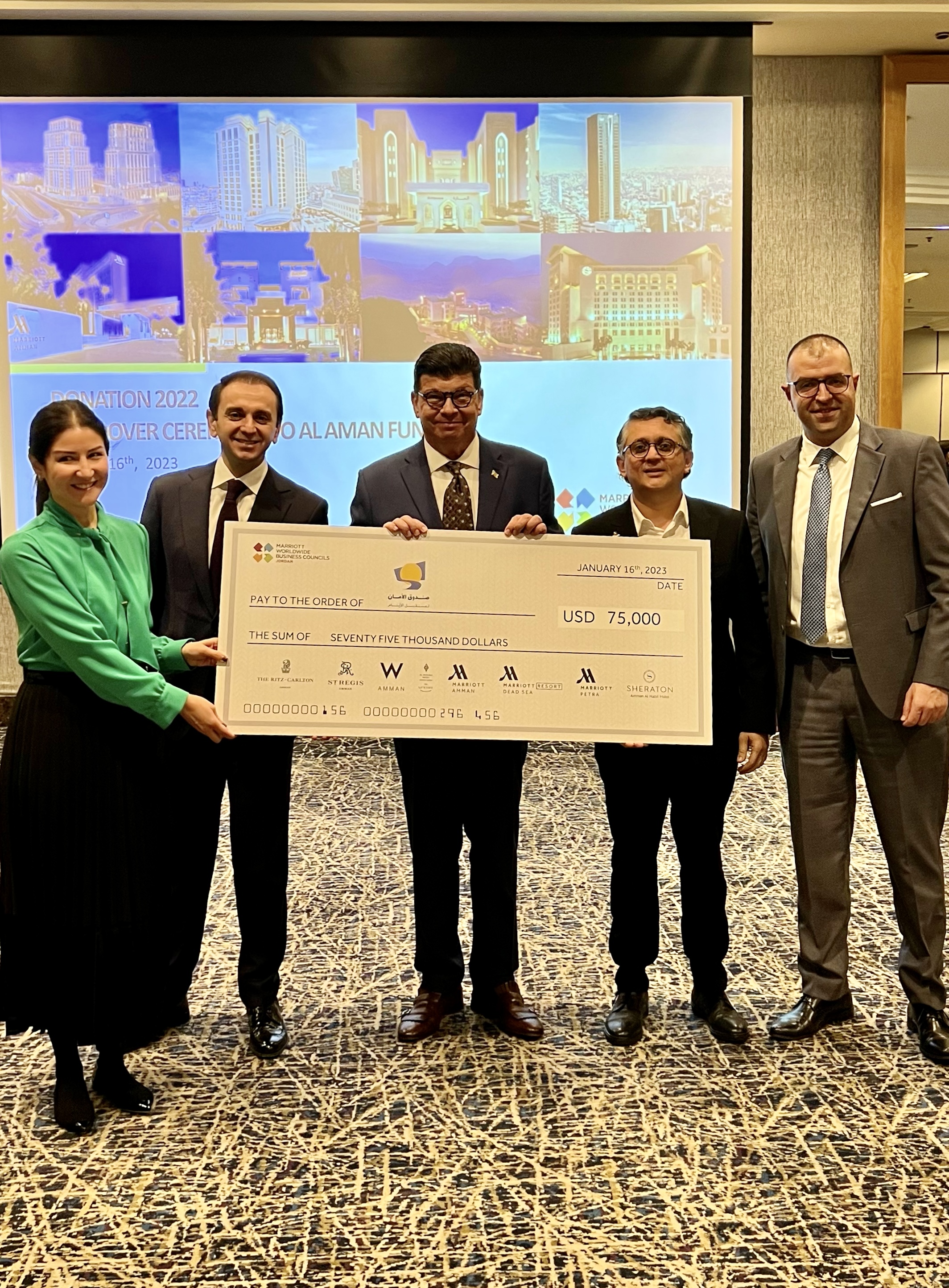 The Donation Handover Ceremony was hosted at the Sheraton Amman Al Nabil Hotel on January 16th, 2023 with participation of the General Manager of Al Aman Fund, Ms. Noor Homoud, the Multi-Property General Manager, Mr. Philip Papadopoulos, the Multi-Property General Manager and JBC Chairman, Mr. Erden Kendigelen, JBC Co-Chairman and General Manager of Dead Sea Marriott Resort & Spa, Mr. Muhannad Hameed, JBC Subcommittee Chair and General Manager of Amman Marriott Hotel, Mr. Laith Naber.
