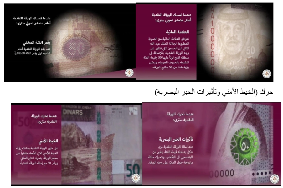 Ammon News - The Central Bank of Jordan (CBJ) urged the public to validate and ensure that security features are shown in the JD50 denomination, which it had previously published and clarified through the official local and social media outlets, as well as on the CBJ's website.