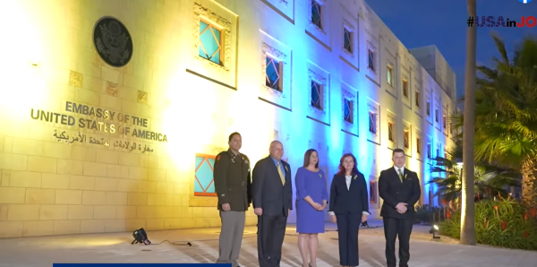 Ammon News - On the occasion of the one-year anniversary of Russia’s brutal attack on Ukraine, Chargé D’Affaires Stefanie Altman-Winans welcomed Ukrainian Ambassador to Jordan Myroslava Shcherbatiuk, to a ceremony to light up the U.S. Embassy in Amman in the colors of the Ukrainian flag.