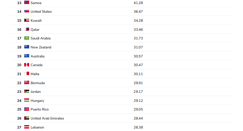 It is followed by Qatar in 16th place globally and second in the Arab world, with an obesity rate of 33.46%, then in 17th place globally, the Kingdom of Saudi Arabia, and third in the Arab world, with a rate of 31.73%.