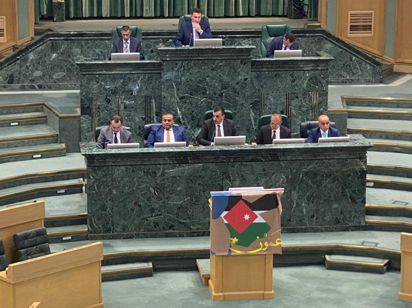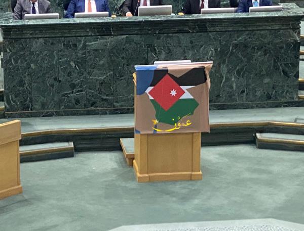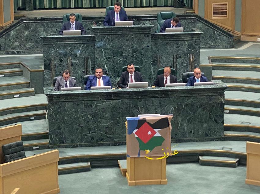 Ammon News - The Jordanian parliament responded to the Israeli Minister of Finance's use during an event in Paris of a map of Israel that includes the borders of Jordan and the occupied Palestinian Territories, by hanging the Jordanian and Palestinian maps bearing the flags of the two countries on the parliament platform.