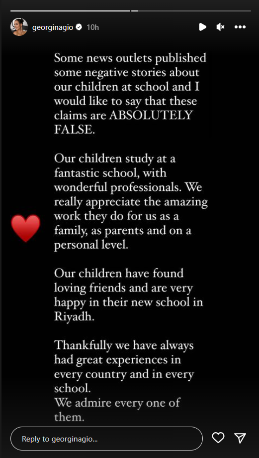 Argentinian model Georgina Rodriguez on Monday refuted media claims that her children are having a hard time in schools in Saudi Arabia.