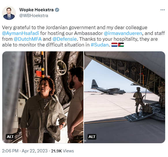 "Very grateful to the Jordanian government and my dear colleague Ayman Safadi for hosting our Ambassador Irma van Dueren, and staff from Dutch Ministry of Foreign Affairs and Dutch Ministry of Defence. Thanks to your hospitality, they are able to monitor the difficult situation in Sudan.," Hoekstra said in a tweet on his official account.