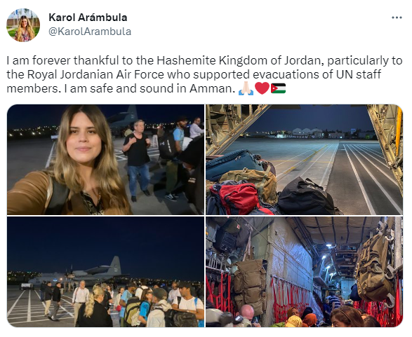 In a Tweet, Karol Arámbula said: "I am forever thankful to the Hashemite Kingdom of Jordan, particularly to the Royal Jordanian Air Force who supported evacuations of UN staff members. I am safe and sound in Amman."