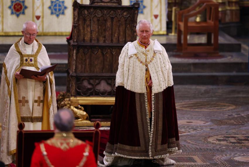 In front of a congregation of about 100 world leaders and a television audience of millions, the Archbishop of Canterbury, the spiritual leader of the Anglican Church, slowly placed the 360-year-old St Edward's Crown on Charles' head as he sat upon a 14th-century throne in Westminster Abbey.