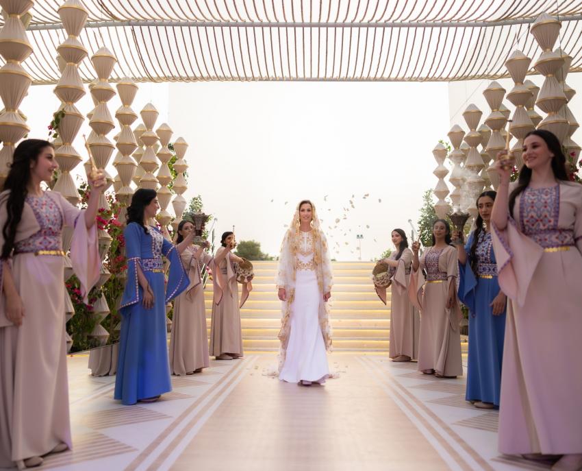 The Jordanian heritage was even demonstrated through the henna ceremony for the bride-to-be, Miss Rajwa, which was held at the Zahran Palace by Her Majesty Queen Rania. In addition, His Royal Highness Prince Omar bin Faisal hosted a traditional bath ceremony for the groom at his father’s residence.