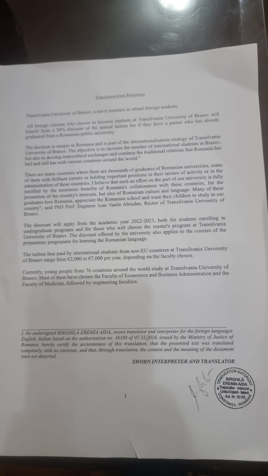 Ammon News - The University of Transylvania Brasov announced a new system to attract foreign students, so that they can benefit from a 50% discount of the annual tuition fee if they have a parent who has already graduated from a Romanian public university.