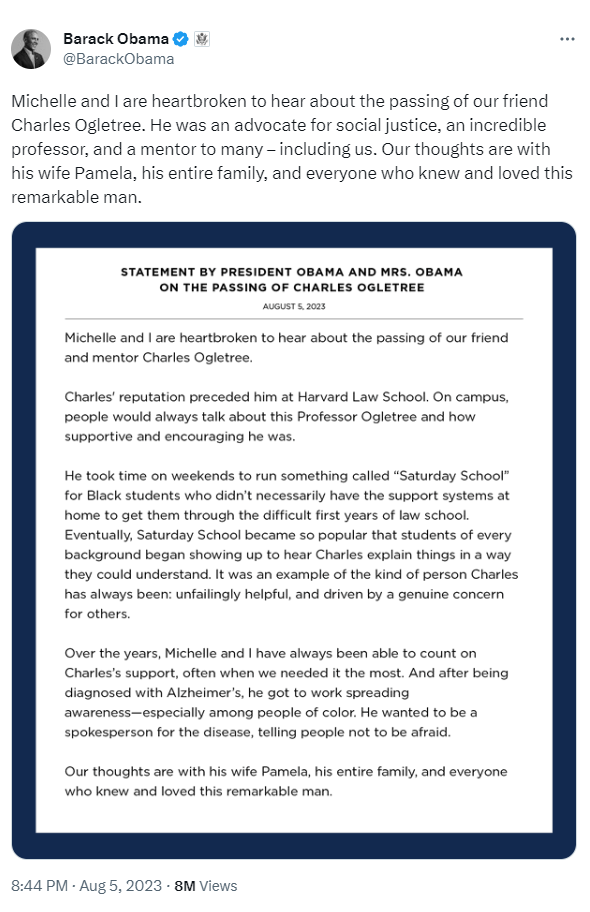 "Michelle and I are heartbroken to hear about the passing of our friend Charles Ogletree. He was an advocate for social justice, an incredible professor, and a mentor to many – including us. Our thoughts are with his wife Pamela, his entire family, and everyone who knew and loved this remarkable man", Obama wrote on Twitter (now known as X).