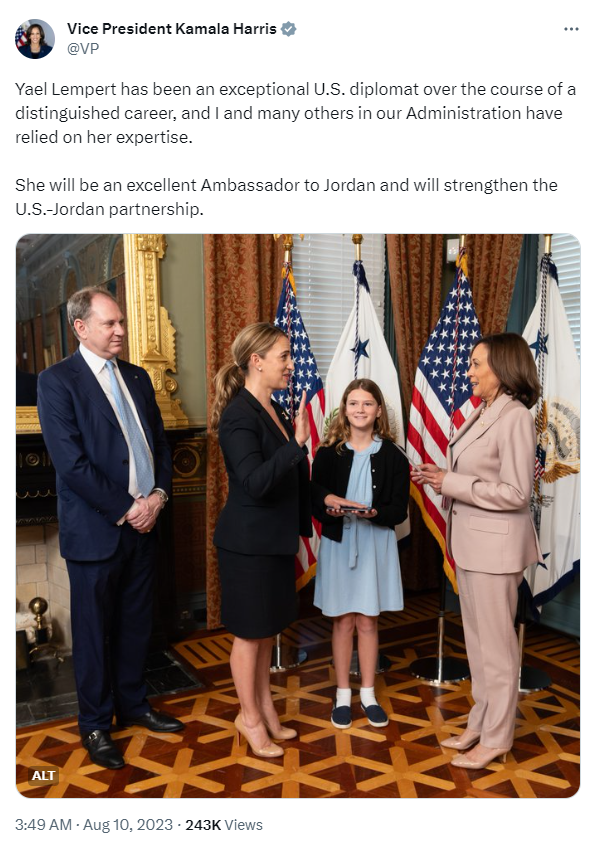 "Yael Lempert has been an exceptional U.S. diplomat over the course of a distinguished career, and I and many others in our Administration have relied on her expertise, VP wrote on Twitter (now known as X).