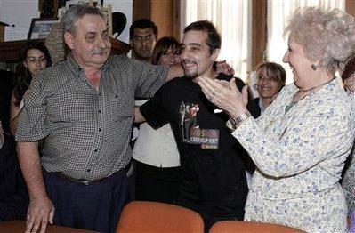 ** AP – Francisco Madariaga Quintela, center, is welcomed by his father Abel Pedro Madariaga and Estela de Carlotto, …