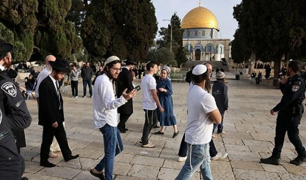 Meantime, scores of Israeli Jewish settlers entered the compound in separate groups, where they conducted provocative tours through the courtyards of the mosque, received explanations about the alleged "Jewish Temple," and performed Talmudic rituals near the Dome of the Rock.