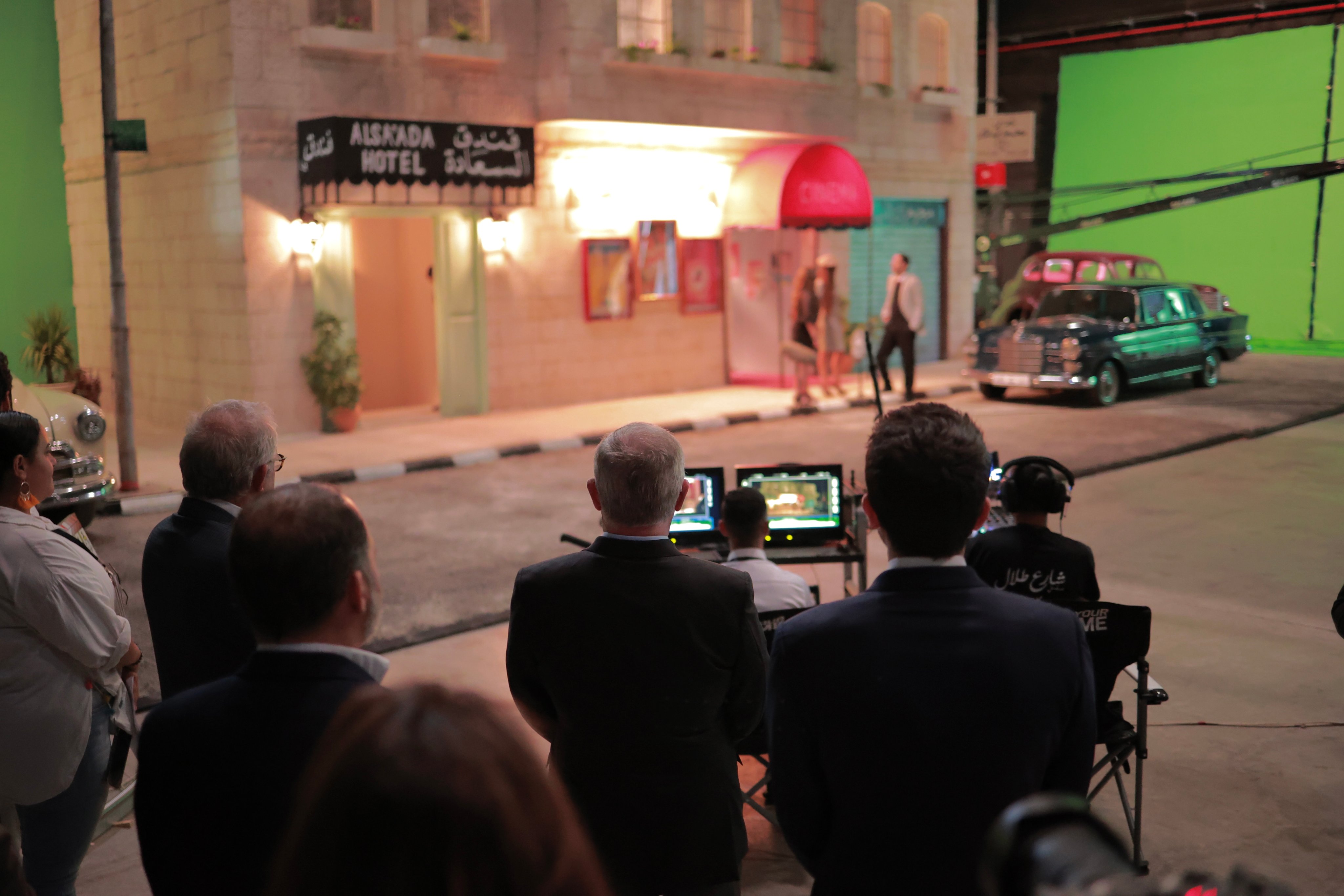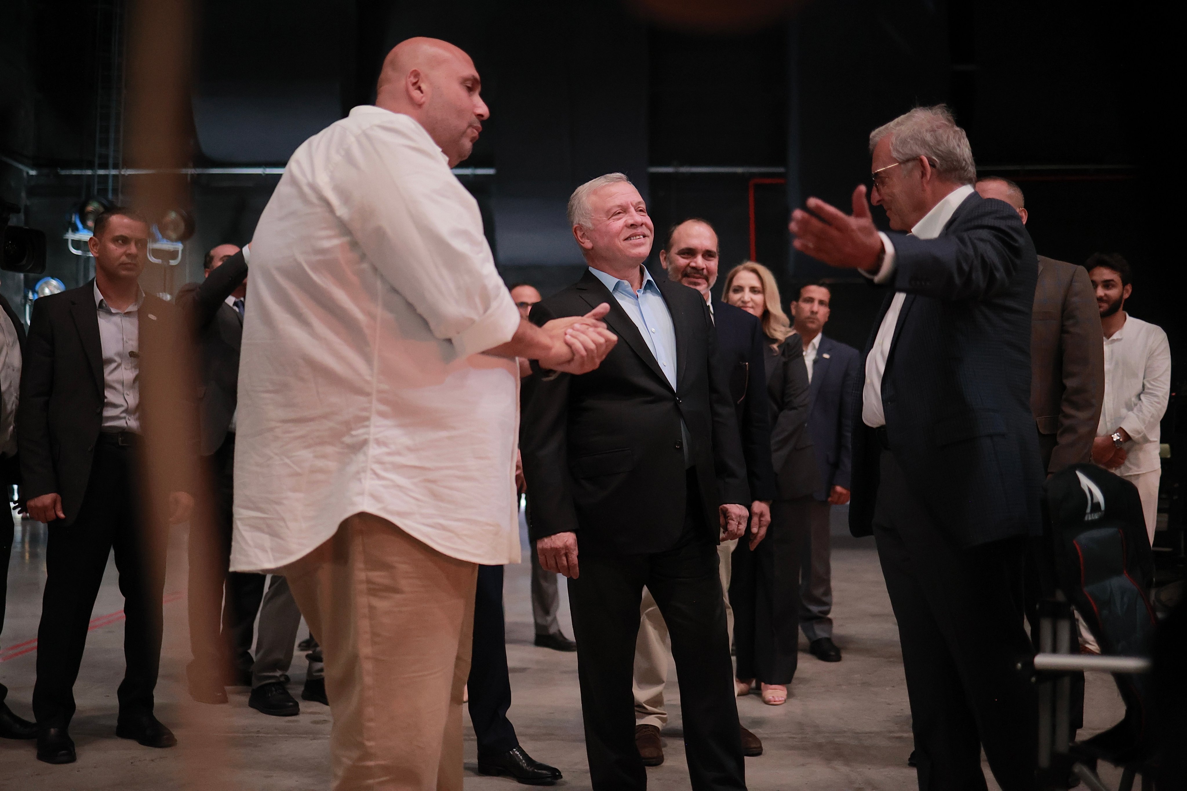 King Abdullah toured the studios, which were built on an area of 47 dunums in Mugabalein area and include two sound stages with an area of 1,500 square metres each, a workshop for carpentry, ironwork, wardrobe, and graphics, as well as administrative offices, and supporting facilities and production offices.