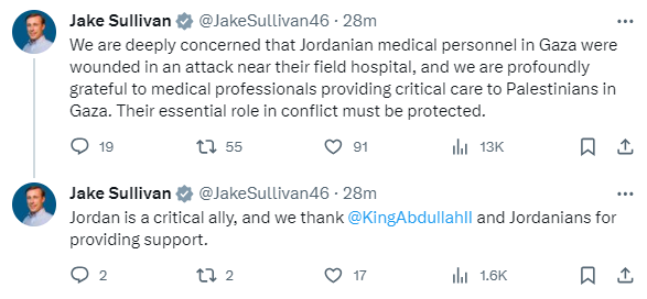 Sullivan wrote on X: "We are deeply concerned that Jordanian medical personnel in Gaza were wounded in an attack near their field hospital, and we are profoundly grateful to medical professionals providing critical care to Palestinians in Gaza. Their essential role in conflict must be protected."