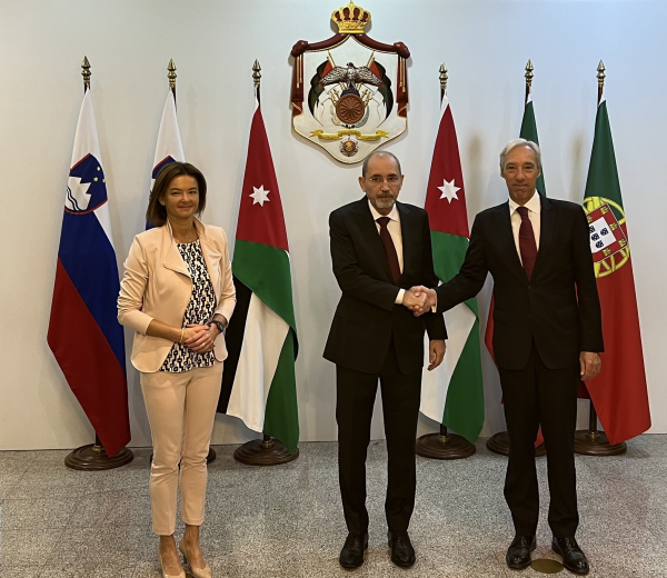 Ammon News - Deputy Prime Minister and Minister of Foreign Affairs and Expatriate Affairs, Ayman Safadi, held Saturday a joint press meeting with his counterparts, Slovenian Foreign Minister Tanja Vaillon, and Portuguese Foreign Minister João Cravinho.