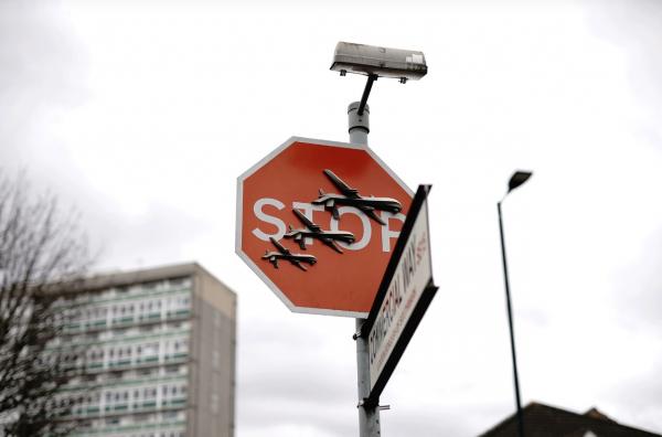 The aircraft on the stop sign resembled those from Banksy’s 2017 artwork Civilian Drone Strike, which depicted a trio of drones bombing a childlike drawing of a house. It was auctioned at Art The Arms Fair and raised £205,000 for Reprieve and Campaign Against Arms Trade.