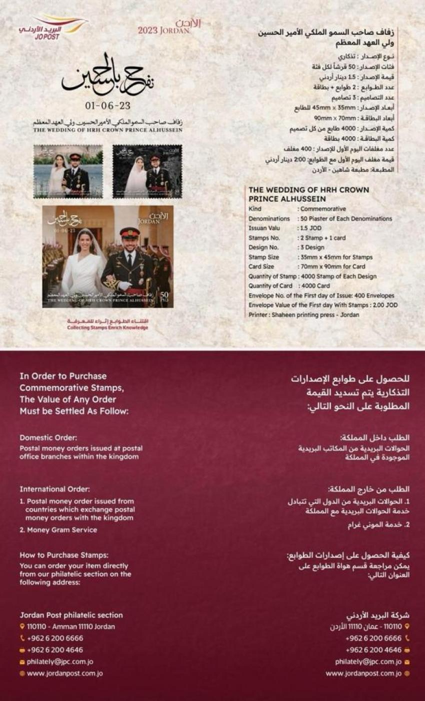 Ammon News - The Jordan Post Company on Sunday announced the launch of a new commemorative stamps on the occasion of the wedding of His Royal Highness Crown Prince Al Hussein bin Abdullah II, and Princess Rajwa Al Hussein.