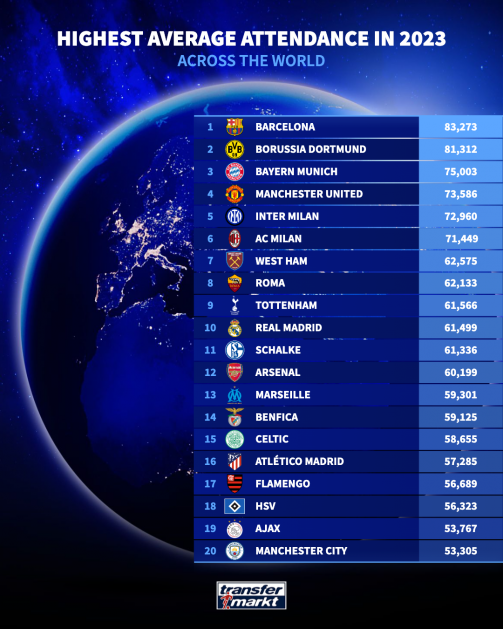 Ammon News - The most attended football stadium in the world in 2023 was none other than the Camp Nou, where 83,273 spectators attended on average each Barcelona home league game. The top 16 places on the list unsurprisingly go to European clubs, three of which come from Germany and no less than three come from London specifically. The highest ranked club outside of Europe was Flamengo, who sat 17th with an average attendance of 56,689 fans in 2023.