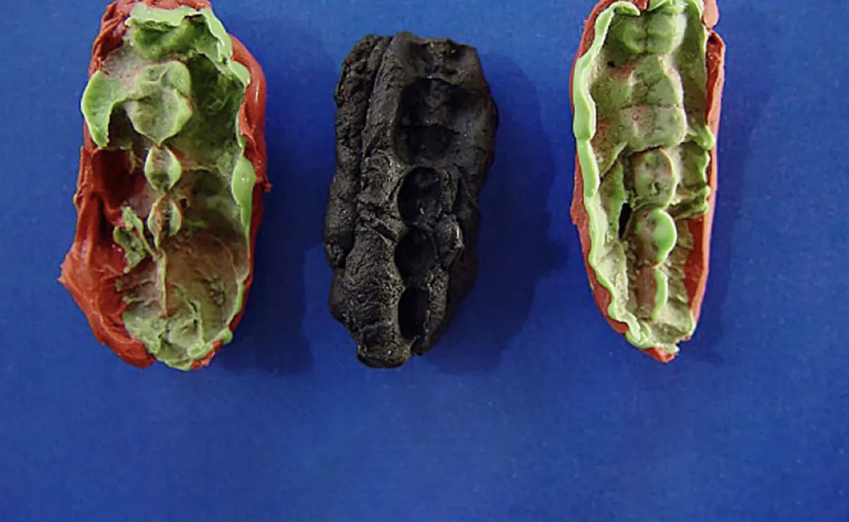 The wads of gum are made from pieces of birch bark pitch, a tar-like black resin, and carry clearly visible teethmarks.