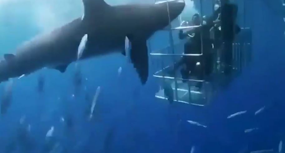 Spine-chilling footage showed the beast furiously swimming towards the cage before its head snapped between the metal bars.