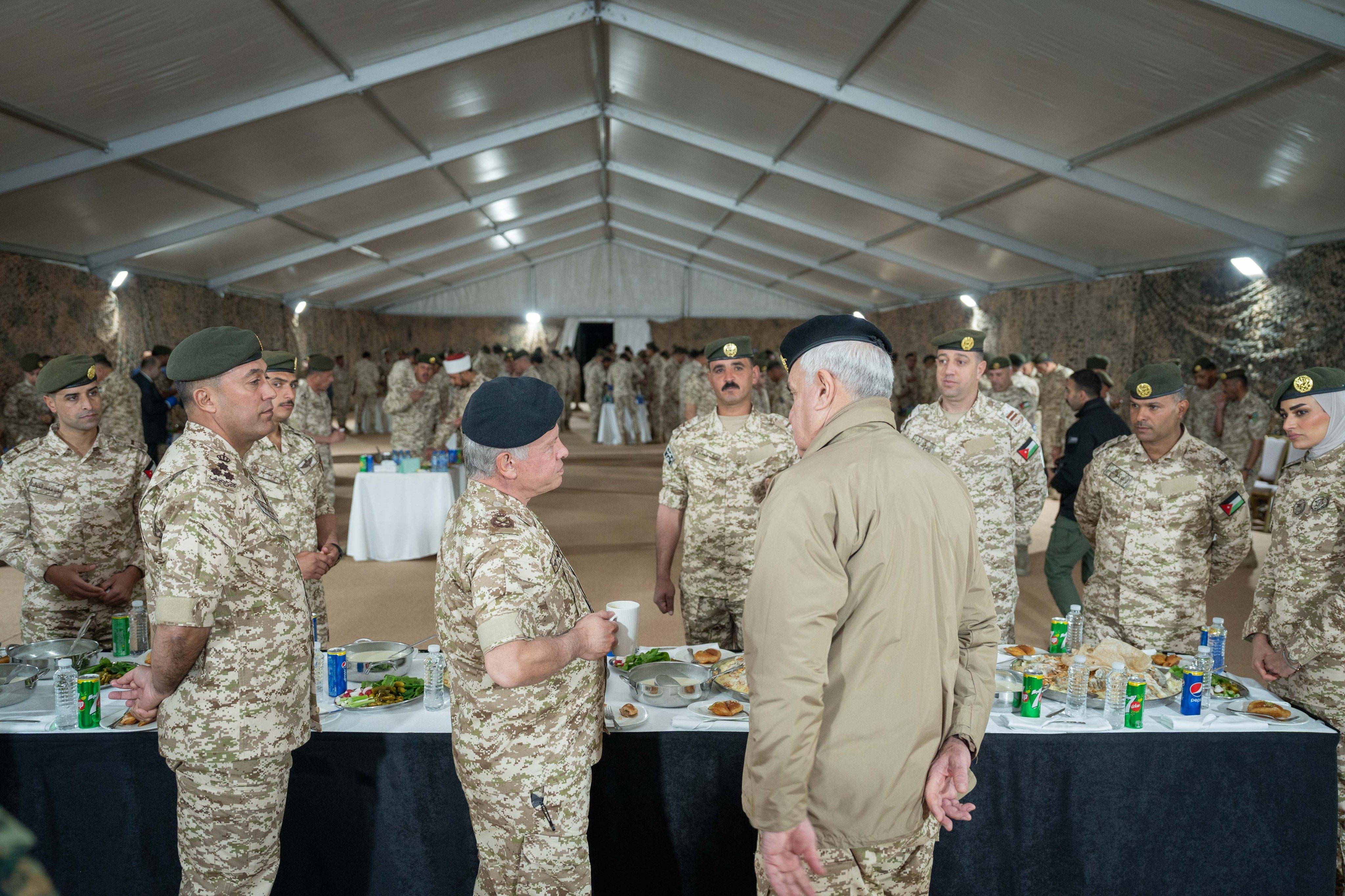 Ammon News - His Majesty King Abdullah II, the Supreme Commander of the Jordan Armed Forces-Arab Army (JAF), on Wednesday joined army personnel at the Southern Military Region’s Prince Zeid bin Al Hussein 93rd Mechanised Brigade for iftar.