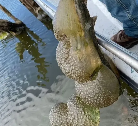 Images of the bizarre sightings surfaced online, showing large, jelly-like balls with a hard exterior hanging from submerged tree limbs.