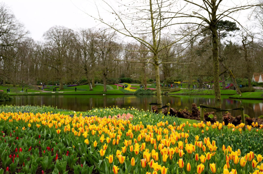Keukenhof park, southwest of Amsterdam in the heart of "bulb country", contains millions of tulips of every colour as well as other flowers across 32 hectares (80 acres).