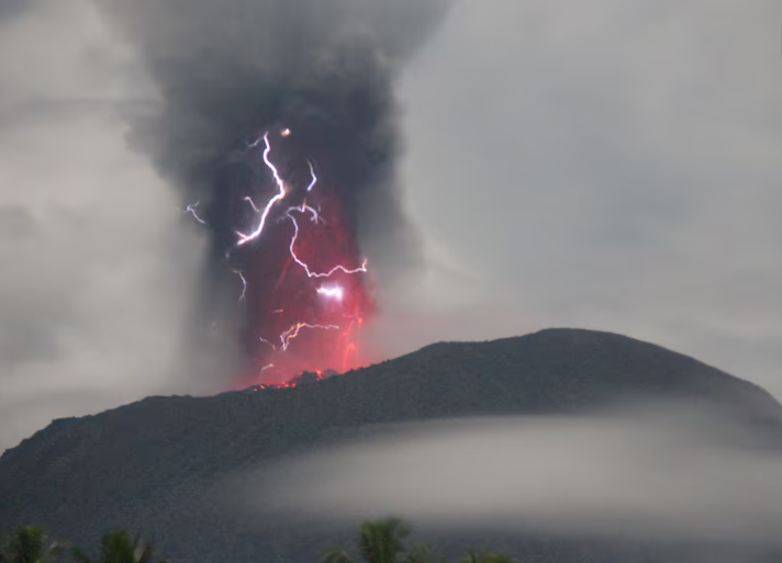 Mt. Ibu erupted on Saturday evening, sending ash 4 km (2.5 miles) high, as streaks of purple lightning flashed around its crater, according to information and images shared by Indonesia's volcanology agency.