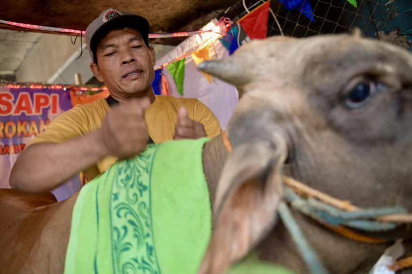 Ammon News - Under a highway in the Indonesian capital Jakarta, a brown cow stood calmly as masseur Sumarwan got to work, clenching his fist to beat the animal's legs and help it relax ahead of its sacrifice.