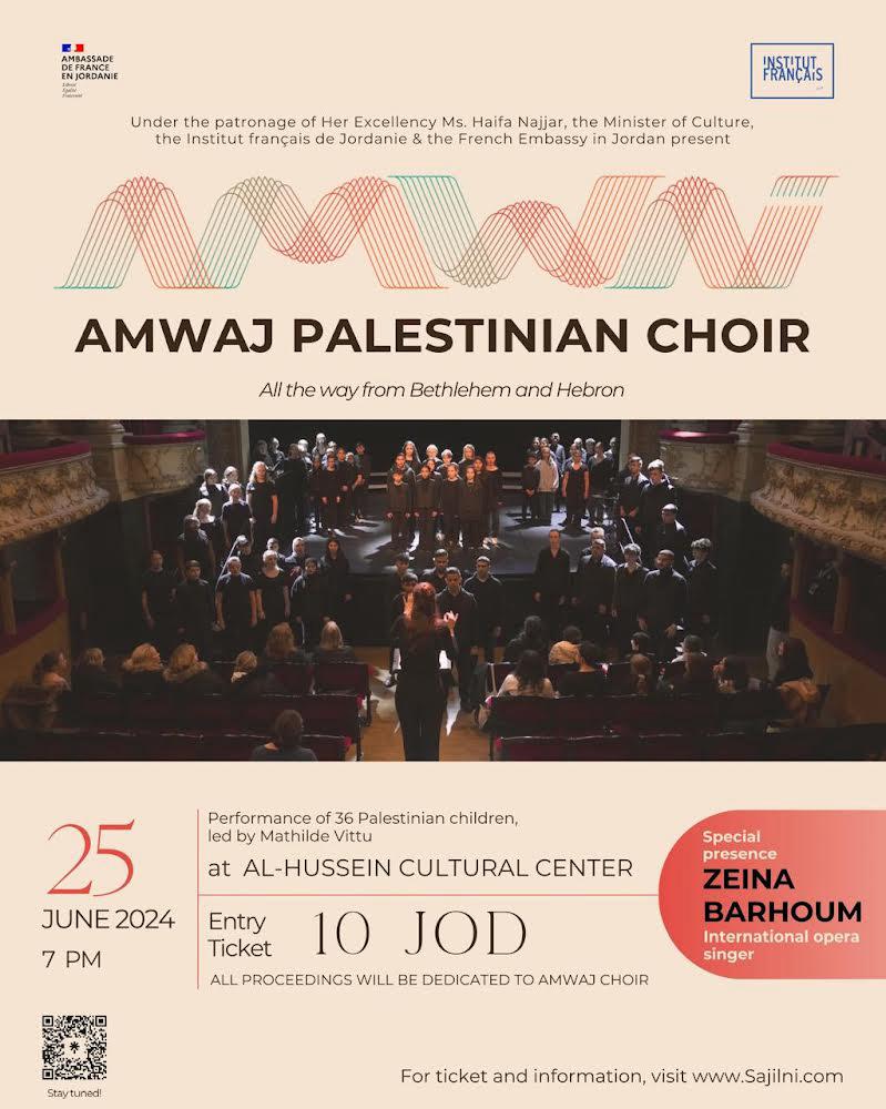 Ammon News - Under the patronage of H.E. Mrs. Haifa Najjar, Minister of Culture, the French Embassy and the French Institute of Jordan organize a concert performed by the Amwaj Choir of Palestine, on Tuesday 25 June, 2024, at 7:00 p.m. at the Al Hussein Cultural Centre in Amman .