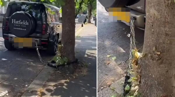 A snap taken in a London street shows one Land Rover Defender - which can cost up to £100,000 - tethered to a tree to try and deter crooks.