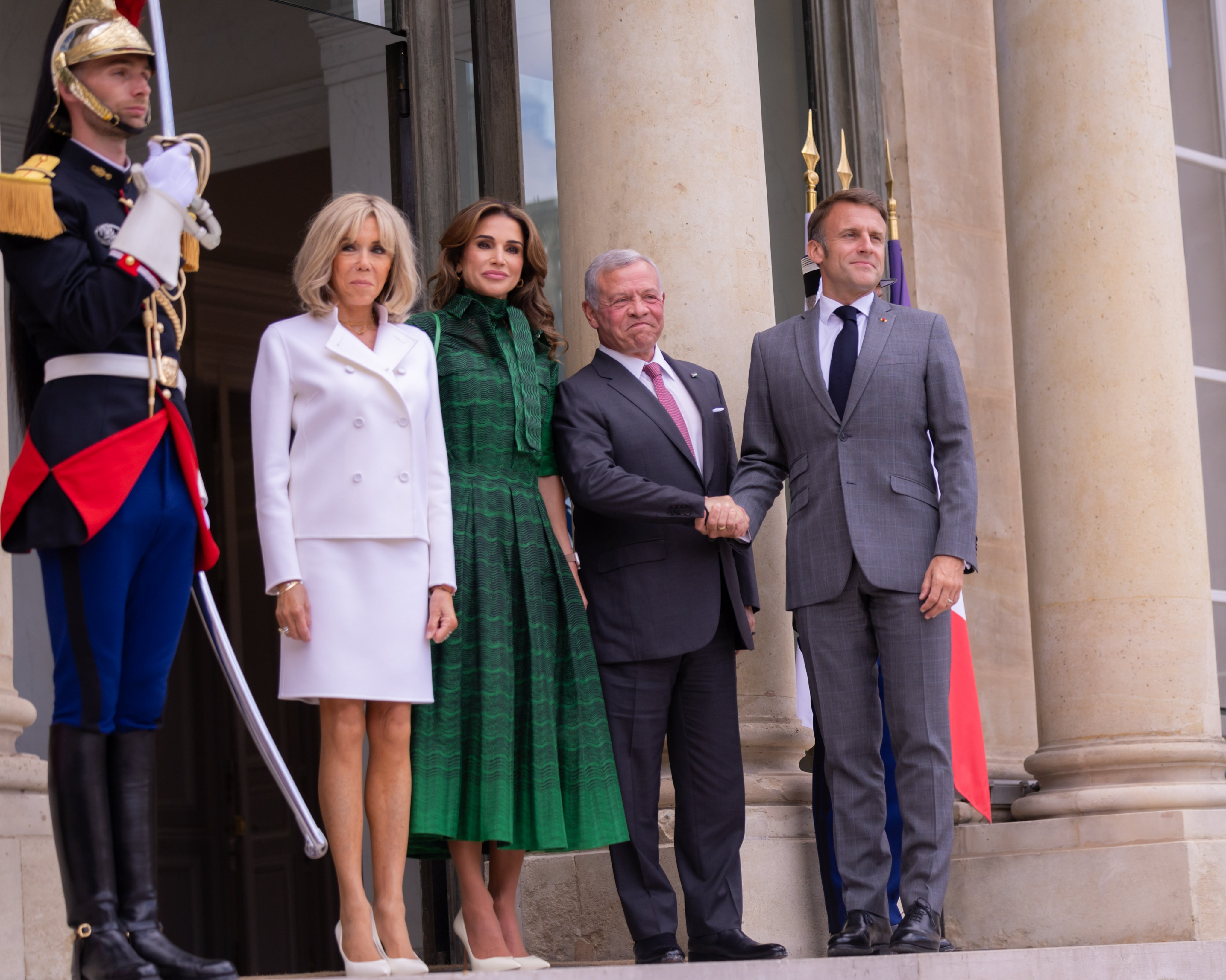 Ammon News - His Majesty King Abdullah II and France President Emmanuel Macron, during a meeting, on June 24, at the Élysée Palace attended by Her Majesty Queen Rania Al Abdullah and Brigitte Macron, discussed the ongoing dangerous developments in Gaza and the catastrophic humanitarian situation.
