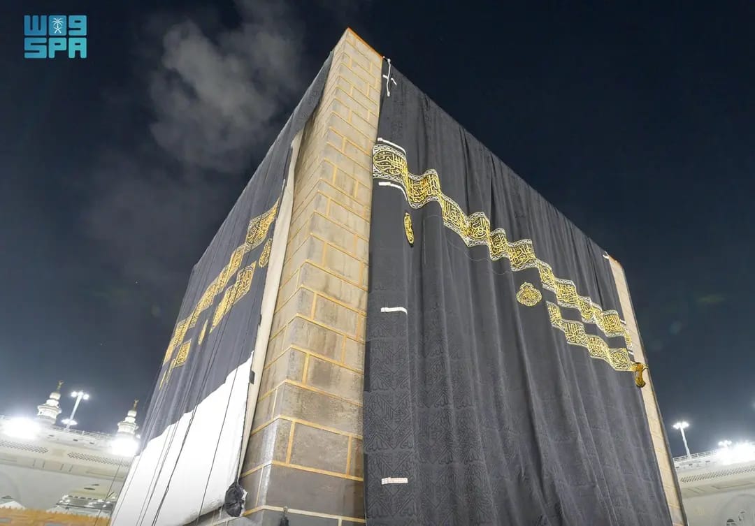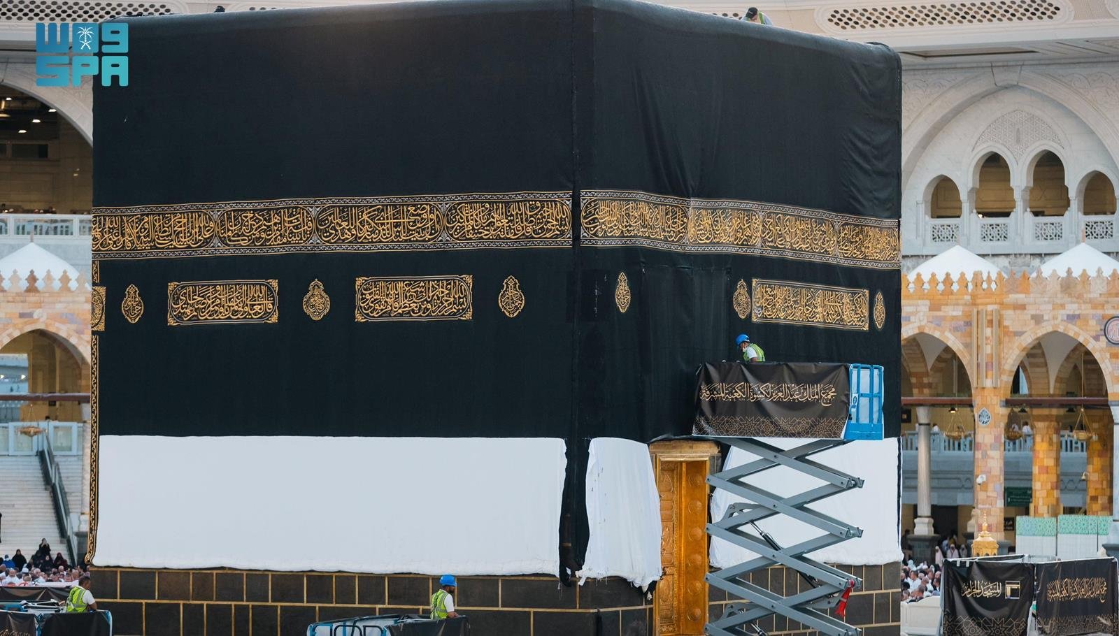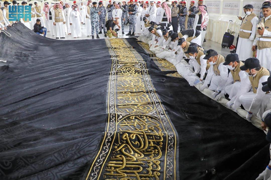 The installed Kiswa, weighing 1,350 kilograms and standing 14 meters high, consists of four separate sides and a door curtain. Each side of the holy Kaaba was individually raised to the top of the Kaaba in preparation for unfolding it over the old covering.