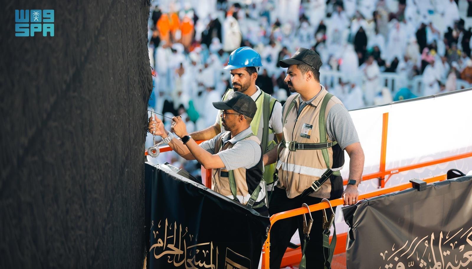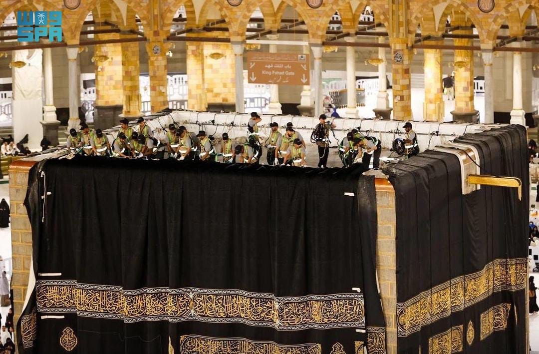 A team from the King Abdulaziz Complex for Holy Kaaba Kiswa, consisting of 159 craftsmen, carried out the replacement. The team, distributed around the sides and roof of the holy Kaaba according to their specializations, began by dismantling the old Kiswa and installing the new one, then fixing it at the corners and on the roof of the holy Kaaba.