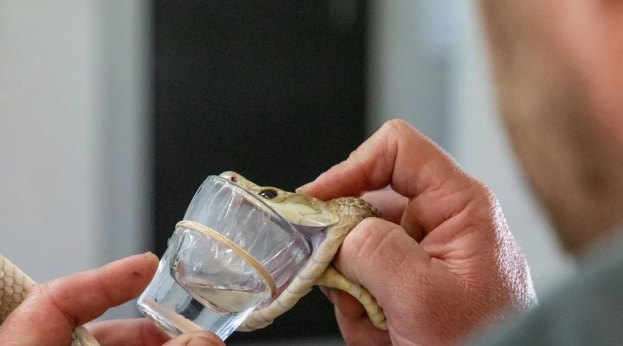 Staff are required to encourage the snakes to bite on plastic pulled to the same tension of human skin to inject their venom.