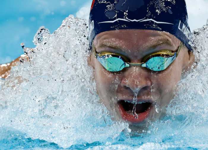 Roared on by a delirious crowd at La Defense Arena, Marchand took down Michael Phelps's Olympic record from Beijing 2008 with a blistering swim of one minute 54.06 seconds, 0.06 seconds short of Ryan Lochte's world record.
